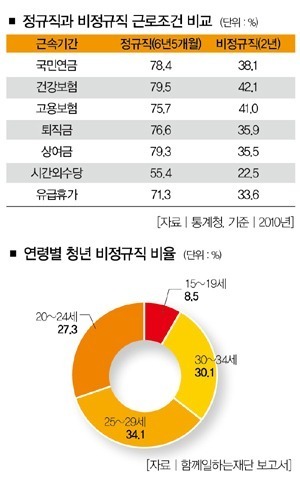 함께일하는재단의 자료에 따르면 만 15세부터 34세까지를 청년층으로 분류했을 때 청년층 정규직 노동자는 약 422만명, 비정규직은 약 174만명이다. 절반에 가깝다. 게다가 전체 비정규직 노동자 중 30.6%가 청년층이다. 쉽게 말해 노동자 2~3명 중 1명은 청년 비정규직이라는 얘기다.