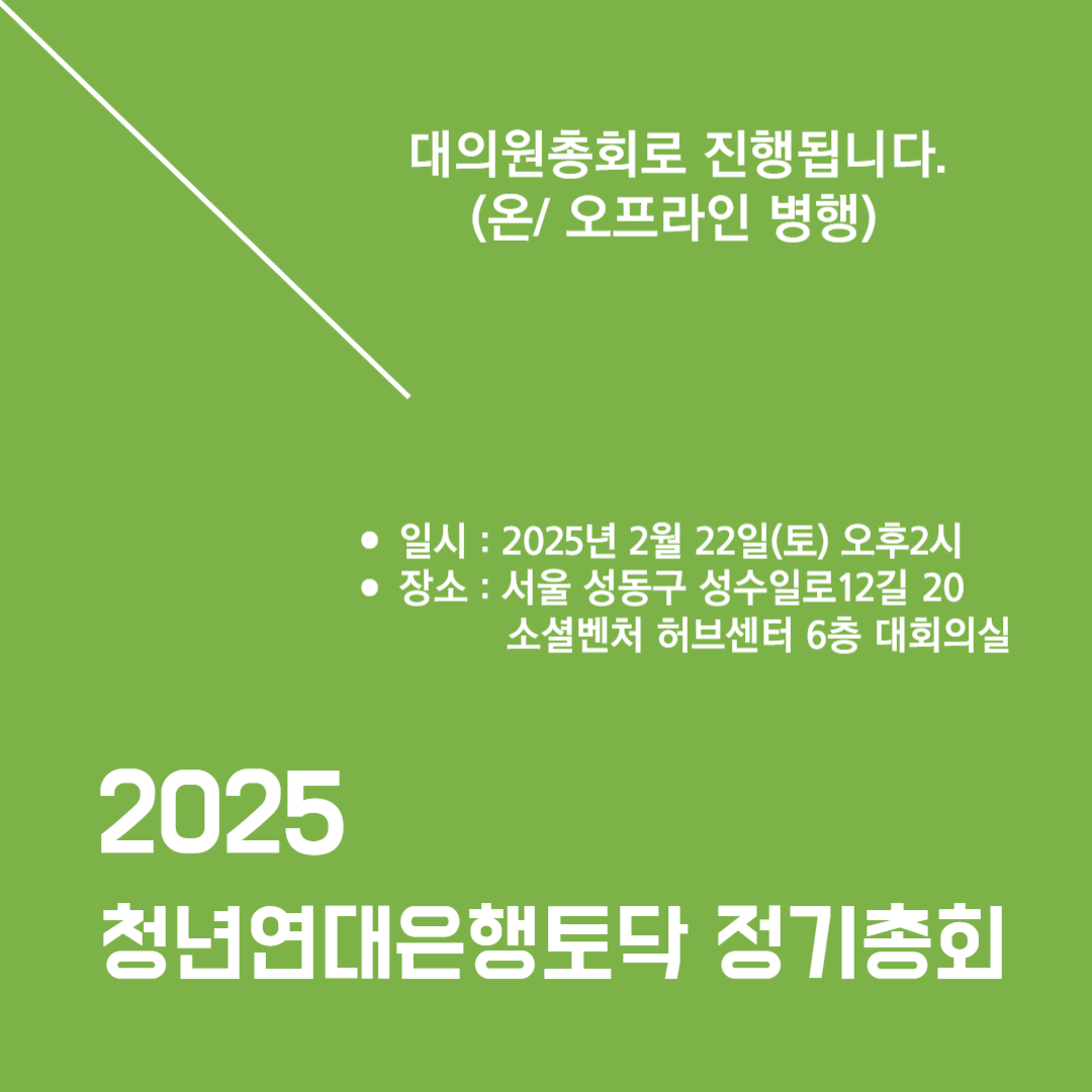 그 시작이 될 '2025년 청년연대은행토닥 정기총회'가 오는 2월 22일(토) 오후 2시에 진행됩니다.
